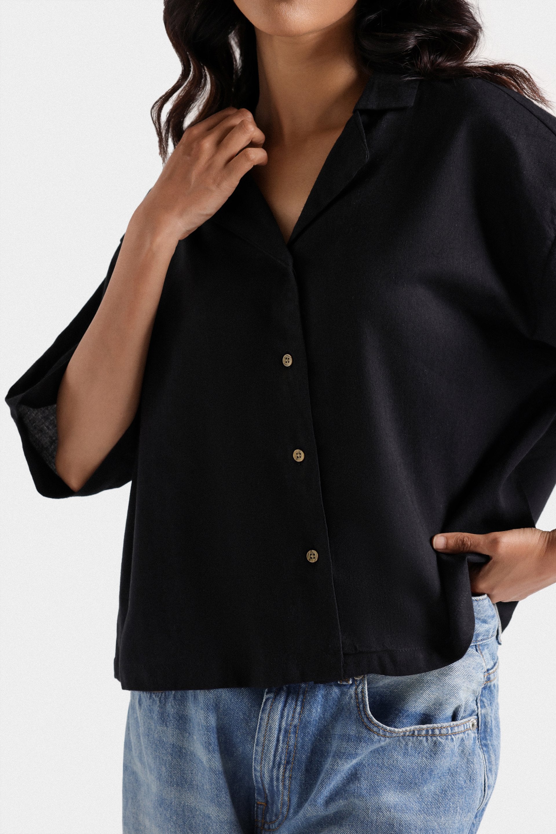 This cropped shirt boasts a relaxed fit and resort collar, making it perfect for a casual yet stylish look. Made with cotton and viscose, it offers a comfortable and breathable feel. Elevate your wardrobe with this basic must-have!